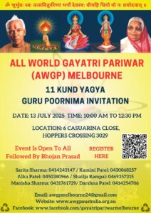 गुरु पूर्णिमा के उपलक्ष्य में आल वर्ल्ड गायत्री परिवार (AWGP) मेलबर्न की तरफ से 11 कुंड यज्ञ करवाए जा रहे हैं। लोगों की तरफ से इस पावन पर्व में परिवार समेत हाजिरी लगवाने के लिए रजिस्ट्रेशन करवाई जा रही है।