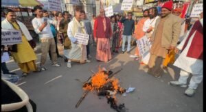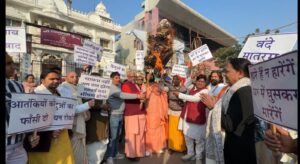 बांग्लादेश में हिंदुओं पर लगातार हो रहे अत्याचारों के विरोध में मंगलवार को वृंदावन स्थित चिंतामणि कुंज के सामने तीखा आक्रोश व्यक्त किया गया। श्रीकृष्ण जन्मभूमि मुक्ति न्यास के आह्वान पर साधु-संतों और सामाजिक प्रतिनिधियों ने मोहम्मद यूनुस का पुतला दहन कर बांग्लादेश में हिंदुओं के साथ हो रहे जुल्म की कड़ी निंदा की। प्रदर्शन के दौरान पूरा वातावरण विरोध और चेतावनी के स्वर से गूंज उठा।