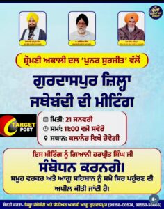 शिरोमणि अकाली दल पुनर सुरजीत की तरफ से 21 जनवरी को कलानौर में एक हंगामी मीटिंग का आयोजन किया गया है।