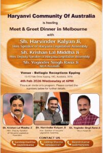 हरियाणवी कम्युनिटी ऑफ़ ऑस्ट्रेलिया की तरफ से बुधवार शाम 6 बजे को स्थानीय BELLAGIO RECEPTION EPPING में एक कार्यक्रम का आयोजन किया गया। मिली जानकारी अनुसार में हरियाणा सरकार में विधानसभा स्पीकर हरविंदर कल्याण , डिप्टी स्पीकर कृष्ण लाल मिड्ढा, विधायक योगेंद्र सिंह राणा असांध इस कार्यक्रम में पहुंचेंगे।